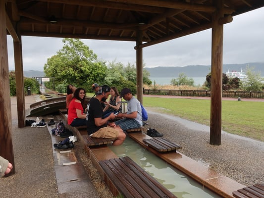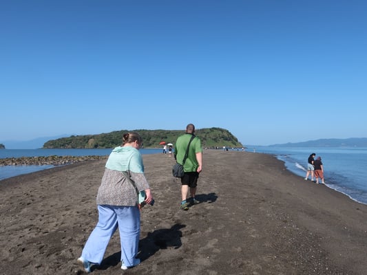 Wanderung durch die Natur, "Onsen-Straße" am Strand (39-42 Grad, Breite 50 cm, Länge: 100 m) zur Erholung der Füße. Wenn das Wetter gut ist, machen wir Picknick an der Küste