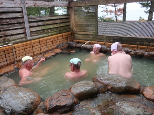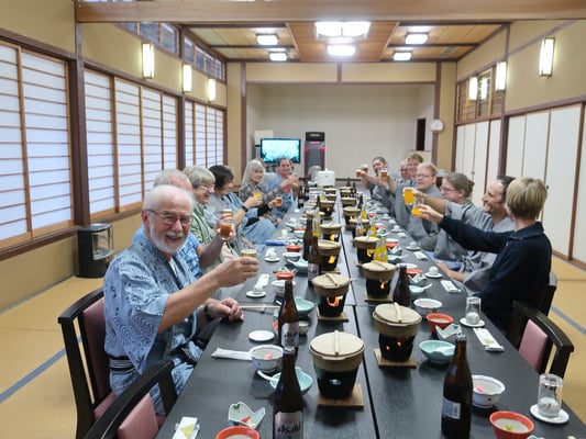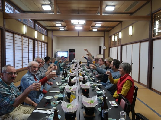 Vormittag Kleine Wanderung ca. 2,5 Stunden (freiwillig), mit dem Hotel-Bus zum Supermarkt. Thermalbad unter freiem Himmel. Gemeinsames Festmahl, traditionell japanisch mit Bier und warmen Sake und Karaoke (freiwillig!)