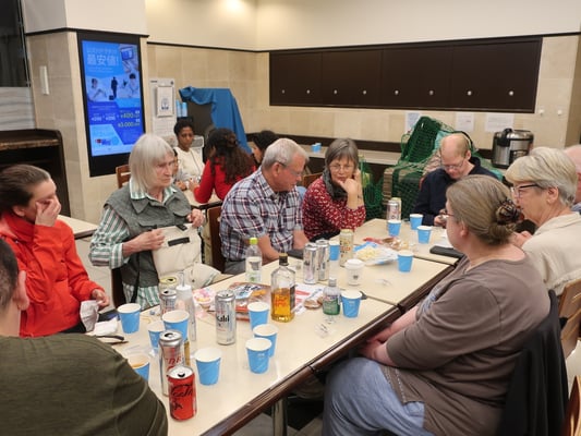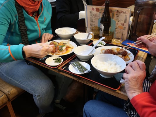 Gemeinsames Festmahl, traditionell japanisch mit Bier und warmen Sake.