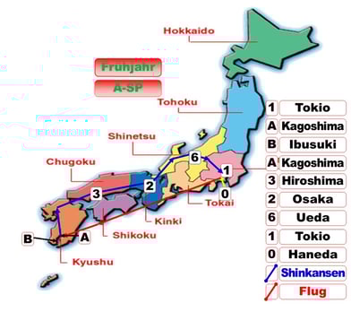 WEITERREISE mit Inlandflug Japan Air Lines nach Kagoshima. Ankunft, Transport zum Hotel