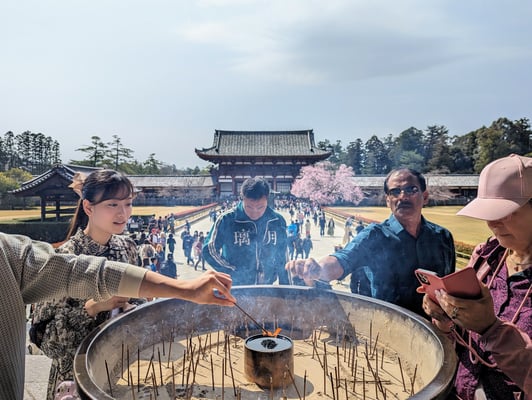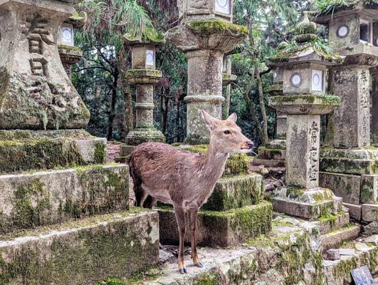 Japans erste Hauptstadt bietet Kultur und Natur satt und wir picken uns das Beste heraus. Nachdem wir Nara mit der Bahn (ca. 90 Minuten) erreicht haben, geht es zum Tôdai-ji Tempel. Der dort erbaute Große Buddha sollte auf keiner Japanreise fehlen. Und beim kleinen Spaziergang durch die bewaldeten Hügel um den Kasuga-Schrein atmen wir noch einmal durch.