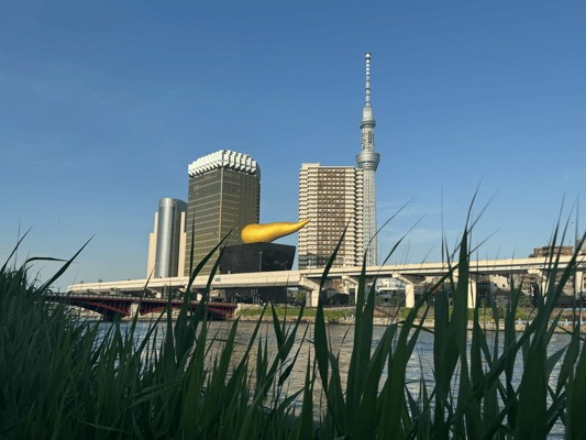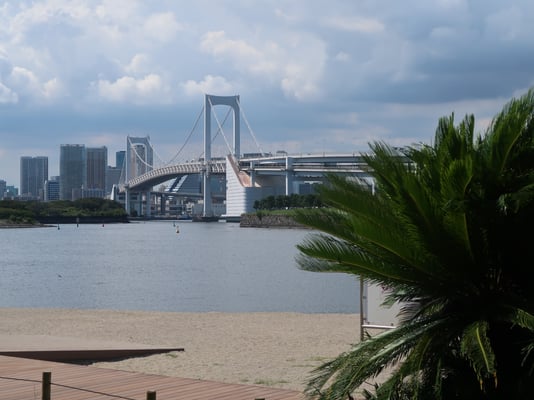 z. B. kleiner Strand mit Blick auf Tokios Skyline