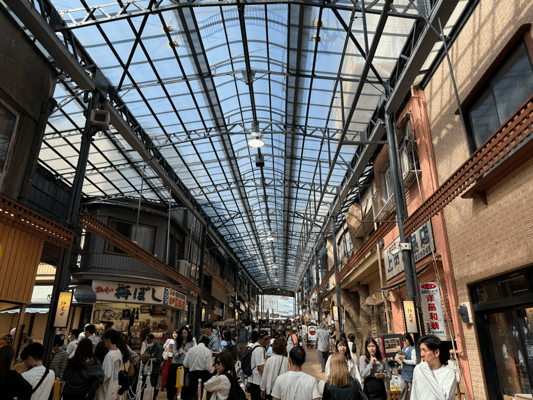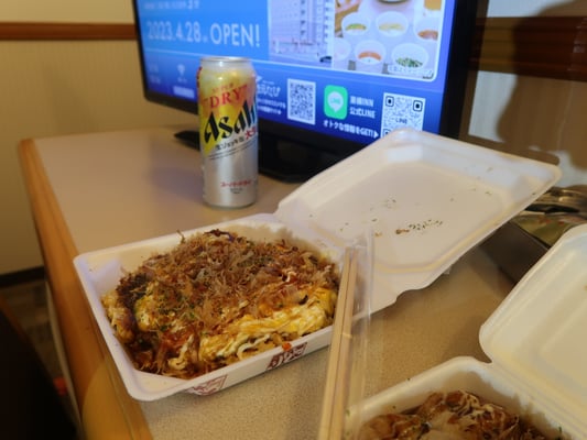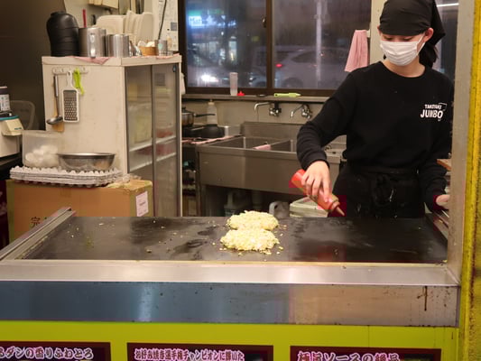 Am Abend locken in Juso unzählige Restaurants und Imbisse mit köstlichen Speisen: Sushi, Ramen oder das hier beheimatete Takoyakai (herzhafte Teigbällchen mit einem Stück Oktopus).