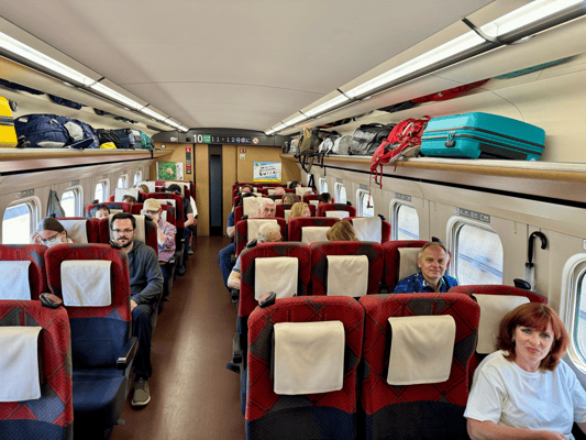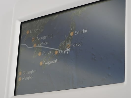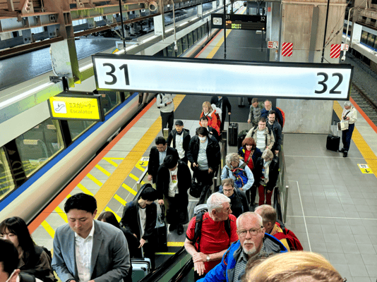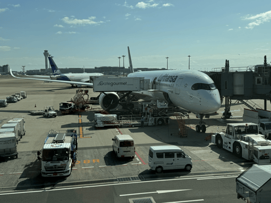 Es geht los... Wir treffen uns am Gate zum Flug LH 714 in München. Wir fliegen Economy Class. Die Flugzeit ist 12:40 bis 9:00, also etwa 13 Stunden. An Bord werden zwei warme Mahlzeiten serviert und es stehen ausreichend Snacks und Getränke zur Auswahl. In Tokio sammeln wir uns in der Ankunftslobby.