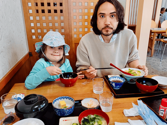 Leckerer Toast und frischer Kaffee sind eine willkommene Frühstücksabwechslung. Nach dieser Stärkung wartet ein gemütlicher, etwa 2 Stunden langer Spaziergang durch Wald und Dorf. Im Supermarkt versorgen wir uns mit einem Snack. Natürlich steht uns auch heute wieder das wunderschöne Freiluft Onsen zur Verfügung. Abends wird noch einmal in großer Runde festlich gespeist.