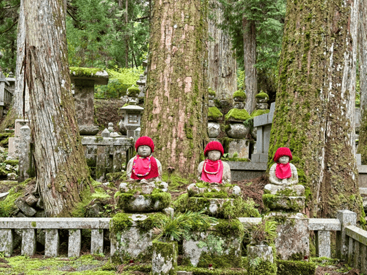 Normal wäre nur eine Übernachtung... Aber wir wollen Koyasan nicht "abklappern", sondern als Ort der Natur und Einkehr genießen. Dies geschieht, je nach eigenem Empfinden (und Wetter), bei einer etwa 4 stündigen Wanderung durch Berge und Wälder oder einfach beim freien Entdecken der Tempelstadt. Außerdem ist heute viel Zeit für den 1200 Jahre alten Friedhof Ôkuno'in, auf dem Feldherren, Unternehmer, Künstler und andere einflussreichen Personen aller Jahrhunderte ihre Ruhe fanden.
