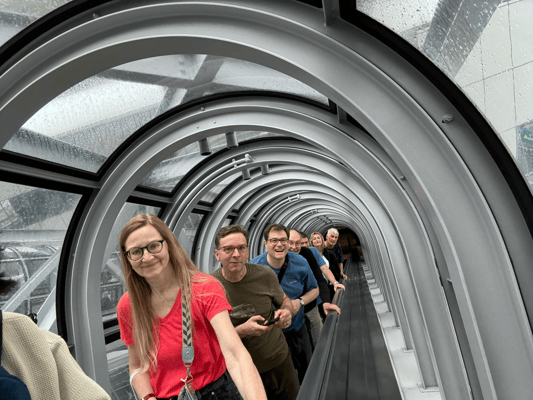 "Mit inzwischen traumwandlerischer Sicherheit bewegt sich die Gruppe durch die Stadt oberirdisch & unterirdisch … na ja fast.. - zur Sicherheit haben wir immer den vorauseilenden Reiseleiter im Blick. Die in Gedanken versunkenen Reiseteilnehmer, ich schließe mich nicht aus, die in alle Himmelsrichtungen abzudriften drohen, werden von Andreas, der auch hinten Augen zu haben scheint, immer noch rechtzeitig zurückbeordert! Zudem hat sich bereits gruppendynamisches Verhalten entwickelt- die Gruppenteilnehmer haben sich gegenseitig im Blick!"