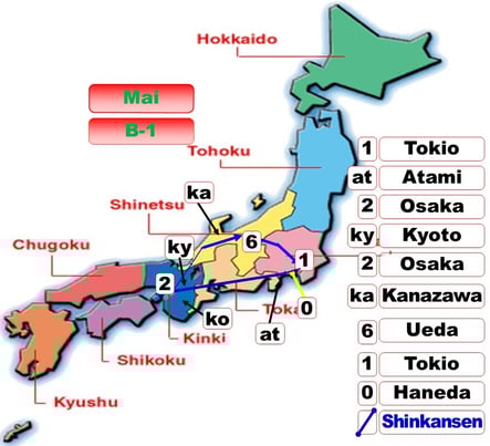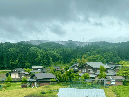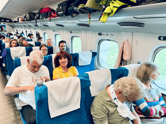 Angenehmer als Fliegen ist eine Fahrt im Shinkansen. Vorbei am Biwa-See, dem größten Japans, geht es durch Berge und Felder in etwa 3 Stunden bis