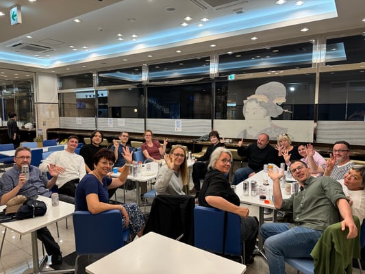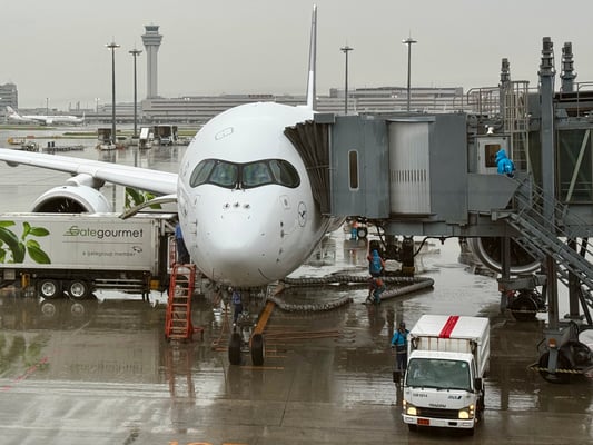 Es geht los... Wir treffen uns am Gate zum Flug LH 716 in Frankfurt. Wir fliegen Economy Class. Die Flugzeit ist 14:00 bis 09:50, also etwa 13 Stunden. An Bord werden zwei warme Mahlzeiten serviert und es stehen ausreichend Snacks und Getränke zur Auswahl. In Tokio sammeln wir uns in der Ankunftslobby.