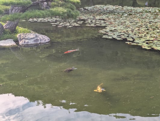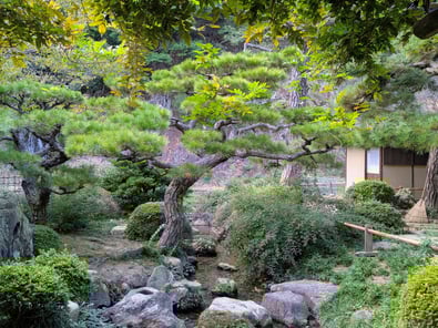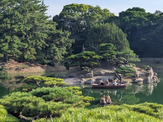 Warum eigentlich "Landschaftsgarten"? Weil die imposante, penibel gepflegte Anlage des Ritsurin Koen den Eindruck einer viel größeren Landschaft vermitteln soll: Seen, Berge und Flüsse... und unter der schwungvoll gebogenen Brücke paddeln ein paar Boote hindurch. Auch Koi-Karpfen, Schildkröten und Störche leben in dieser von Menschen gemachten Oase am Stadtrand von Takamatsu.