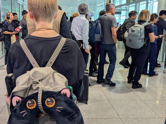 Es geht los... Wir treffen uns am Gate zum Flug LH 714 in München. Wir fliegen Economy Class. Die Flugzeit ist 12:35 bis 08:00 also etwa 13 Stunden. An Bord werden zwei warme Mahlzeiten serviert und es stehen ausreichend Snacks und Getränke zur Auswahl. In Tokio sammeln wir uns in der Ankunftslobby.