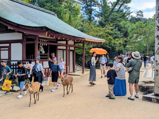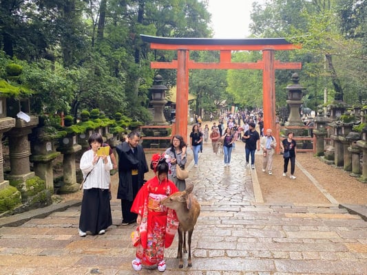 Japans erste Hauptstadt bietet Kultur und Natur satt und wir picken uns das beste heraus. Nachdem wir Nara mit der Bahn (ca. 90 Minuten) erreicht haben geht es zum Tôdai-ji Tempel. Der dort erbaute Große Buddha sollte auf keiner Japanreise fehlen. Und beim kleinen Spaziergang durch die bewaldeten Hügel um den Kasuga-Schrein atmen wir noch einmal durch.
