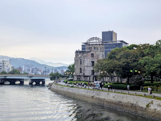 Hiroshima, mon amour... Mit den renommierten Airlines ANA oder JAL fliegen wir von Tokio etwa 90 Minuten westwärts. Ein Shuttlebus bringt uns in einer weiteren Stunde vom ländlich gelegenen Flughafen bis in die Stadt Hiroshima. Nach dem Check In im Hotel erkunden wir erst die lebendige Innenstadt mit den bunten Ladenstraßen und betreten schließlich den Friedenspark, wo wir am Atombomben Dom der unfassbaren Geschichte der Stadt gedenken.