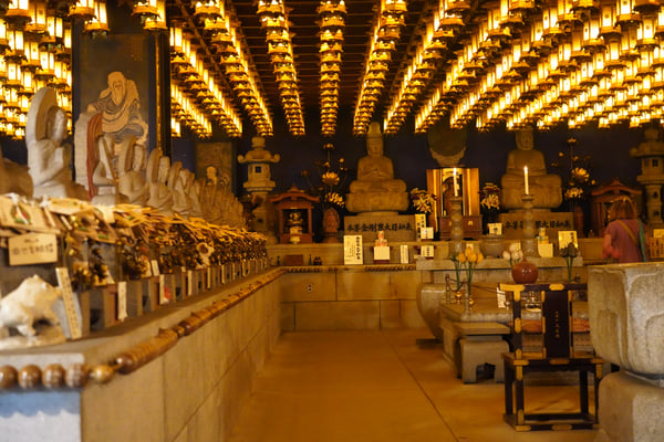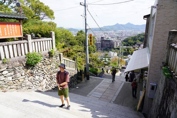 Mit der kultigen "Kotoden" Eisenbahn rattern wir tief ins Innere von Shikoku. Der Konpira Schrein liegt an einem Berghang und ist dem Gott der Seefahrt gewidmet. Bis zum Hauptschrein sind es 785 Stufen, die für gesunde Menschen gut schaffbar sind. Wer danach noch Lust hat, geht die restlichen 583 Stufen bis zum Inneren Schrein, einem sogenannten Power Spot mit besonderer Energie (und einem einzigartigen Glücksbringer...). Als Belohnung genehmigen wir uns die frisch gemachten Udon Nudeln, die hier in der Region wörtlich in aller Munde sind.