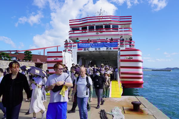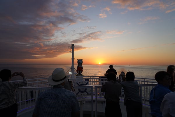 Und das war nur der Vormittag! Danach begeben wir uns gemeinsam mit Taxen zum Hafen, wo wir mit der großen Jumbo Ferry etwa 4,5 Stunden durch die Inlandsee bis nach Kobe und schließlich mit der Bahn weitere 30 Minuten nach Osaka reisen.