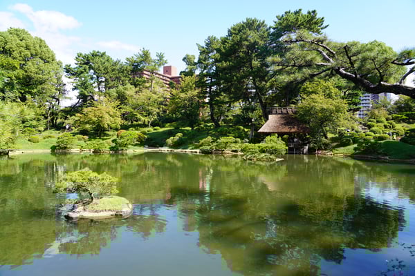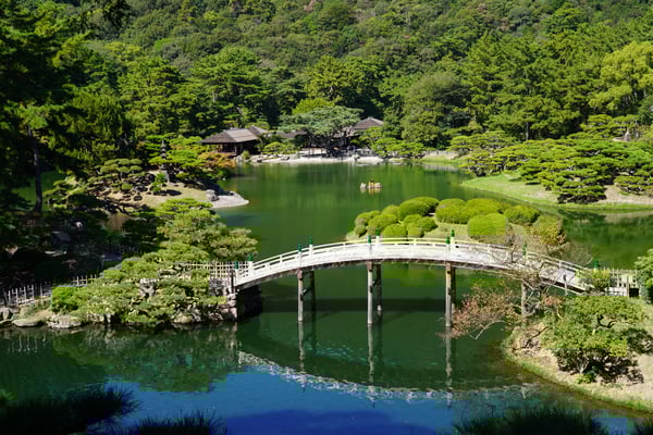 Warum eigentlich "Landschaftsgarten"? Weil die imposante, penibel gepflegte Anlage des Ritsurin Koen den Eindruck einer viel größeren Landschaft vermitteln soll: Seen, Berge und Flüsse... und unter der schwungvoll gebogenen Brücke Paddeln ein paar Boote hindurch. Auch Koi-Karpfen, Schildkröten und Störche leben in dieser von Menschen gemachten Oase am Stadtrand von Takamatsu.