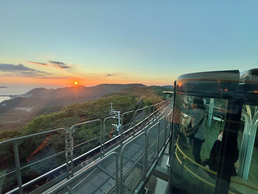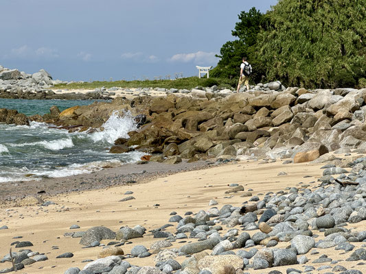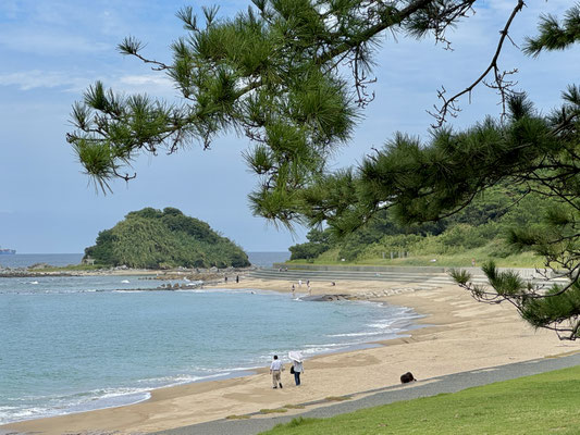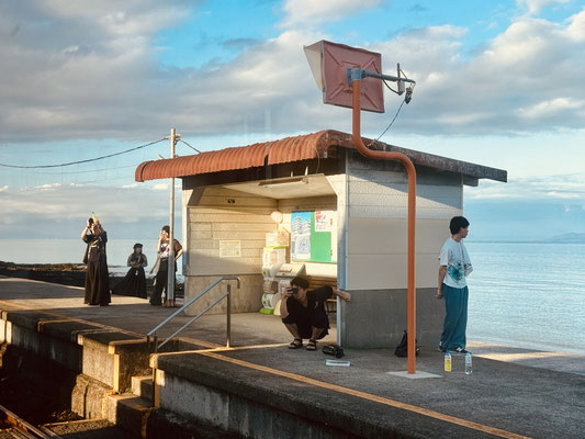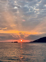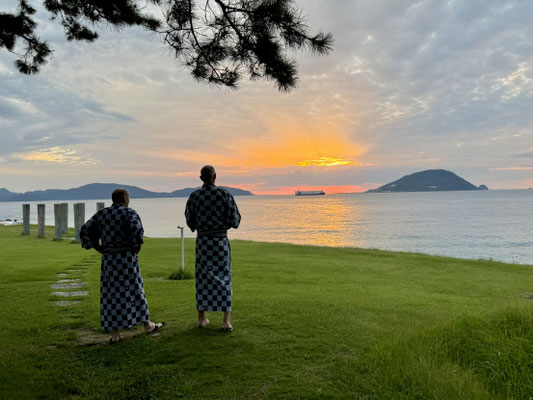 "Auf Shikanoshimas Stränden ist der Sand sehr hell, zwischendurch liegen verstreut grosse schwarze Steine oder schroffe Felsformationen herum. (...) An der Rezeption des Hotels steht auf einer großen Tafel, ab wann genau die Sonne untergeht. Heute ist es um 18:05. Einige von uns beobachten das vom Strand aus, aber vom Zimmer kann man den Untergang auch sehr gut verfolgen. Und wieder haben wir Glück! Wir werden mit einem traumhaft schönen Sonnenuntergang belohnt."