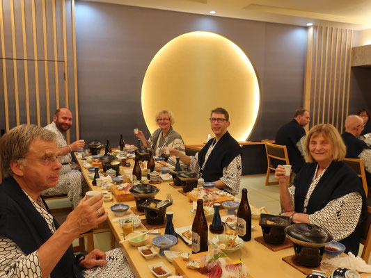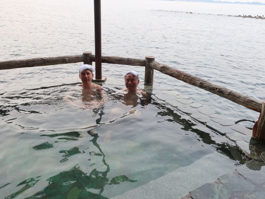 Wir übernachten auf japanische Art in einem komfortablen Onsen-Hotel am Meer mit angeschlossener Fischerei. Das hauseigene Bad bietet einen