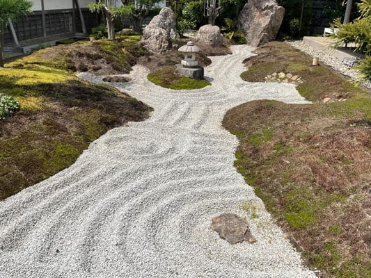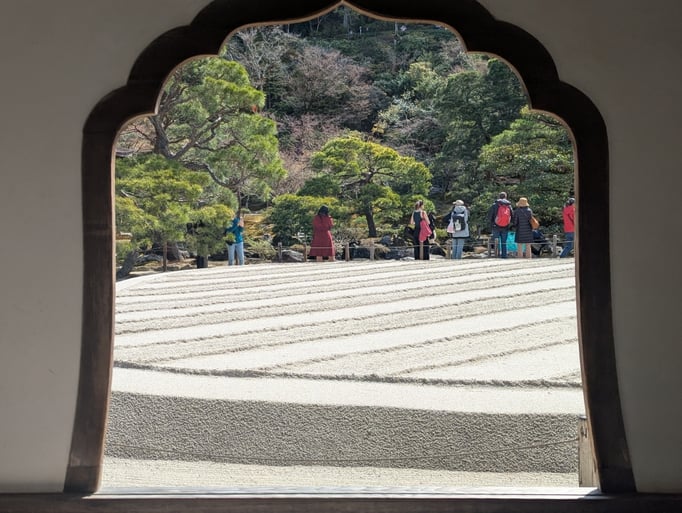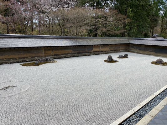 Bei herrlichem Frühlingswetter spazierten wir anschließend zum Ryoanji-Tempel, wo der berühmte Zen-Steingarten auf uns wartete. Zur Belohnung für den kurzen Fußmarsch bekamen wir eine traditionelle japanische Süßigkeit, bevor wir uns in die meditative Atmosphäre des Gartens vertieften. Da sich der Andrang noch etwas in Grenzen hielt ließ sich die besondere Stille und Harmonie dieses Ortes genießen.