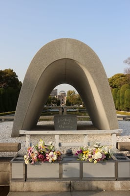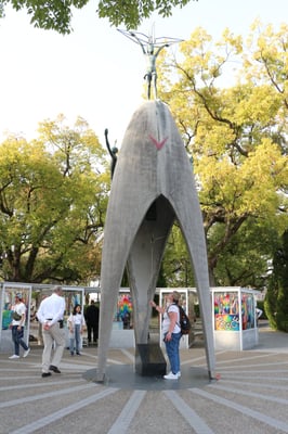 Unseren Besuch beendeten wir im dortigen Teehaus bei einem ausgezeichneten Matchatee und Reiskuchen. Zurück am Bahnhof Hiroshima stiegen wir in die Straßenbahn und fuhren zum "Hiroshima City Museum of Contemporary Art" mit Skulpturenpark. Wir besuchten die Dauerausstellung mit den unterschiedlichsten Werken zeitgenössischer Kunst. Eine Abteilung setzt sich mit dem Atombombenabwurf künstlerisch auseinander. Vom Museum aus gingen wir an einem der vielen Flussläufe entlang zurück zum Hotel, um zu packen.