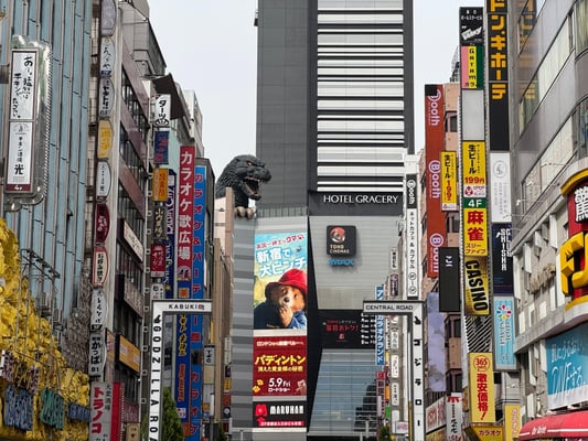 Ein paar Tausend Yen später machten wir uns auf dem Weg nach Shinjuku, das bekannte Ausgehviertel, in dem viel los war - außer in der Golden Gai, die tagsüber wie ausgestorben wirkt. Ein paar Fotoshots hat auch der große Godzilla-Kopf über dem Kino bekommen.