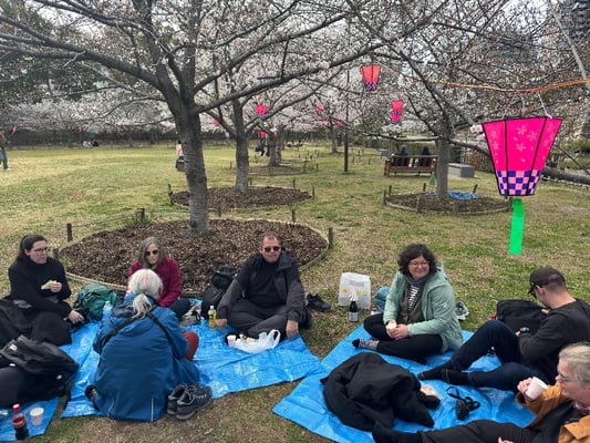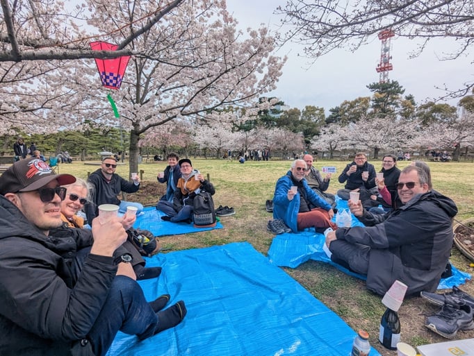 Der Nachmittag stand sonst frei zur Verfügung, aber ein Großteil der Gruppe machte sich auf zu einer „Hanami-Party“ in den Garten der Bugruine von Takamatsu. Auf Matten und mit Sake stießen wir auf die Kirschblüte an.
