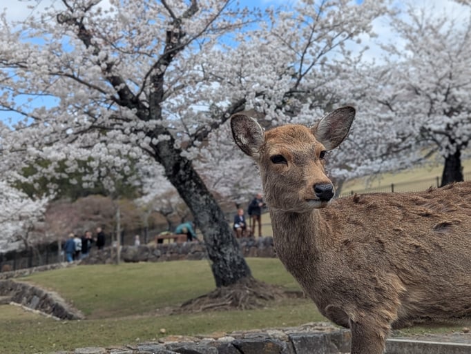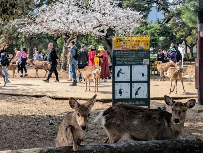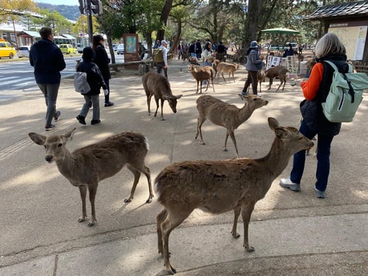 Im Nara Park werden wir von hunderten freundlichen Rehen begrüßt, die frei über die Straßen mit regem Verkehr laufen und überall in der Gegend verstreut sind. Sie freuen sich über jeden Besucher mit etwas Leckereien. Höflich sind sie auch und bedanken sich verbeugend für die knackigen Kekse. Es ist gut, dass so viele Touristen zu Besuch kommen. Die Tierchen werden gut versorgt und sind alles andere als scheu.