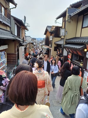 Danach fuhren wir mit dem Bus zum Yasaka Schrein. Hier endete der gemeinsame Ausflug nach Kyoto und der Gruppenverband löste sich auf. Wir gingen in Richtung Altstadt und ließen uns von den Geschäften und alten Fassaden beeindrucken. In einer der Gassen fanden wir eine Silberschmiede, in der Ringe individuell angefertigt wurden. Natürlich ließen wir einen Ring nach unseren Vorstellungen gestalten. Rund um die Gassen der Altstadt wimmelte es von Paaren, die sich in traditioneller Kleidung zur Erinnerung fotografieren ließen. Auch sind uns viele Touristen aufgefallen, die Kostüme traditioneller Kleidung trugen.