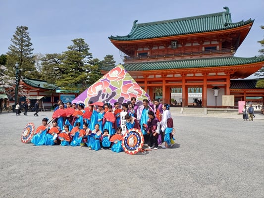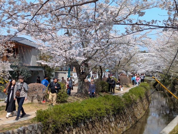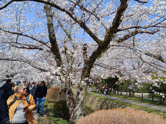 Obwohl es noch relativ früh war, kamen doch schon viele Menschen, um den silbernen Tempel, der allerdings aus Kostengründen nie versilbert worden war, und den Park zu besichtigen. Im Anschluss spazierten wir auf dem sogenannten Philosophenweg, der an einem Kanal entlang führt und von hunderten blühender Kirschbäume gesäumt wird. Auf unserem Weg zum Handicraft Center, direkt gegenüber des Heinan Schreins, fand ein von uns bestauntes Tanzfestival statt.