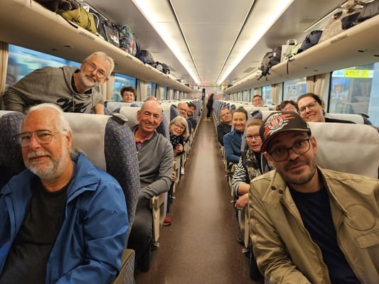 Fahrt mit HK-Line nach Umeda, dann mit JR von Gleis 11 um 9:12 in den „Thunderbird 11“ nach Tsuruga. Der Zug ist neu und die Plätze reserviert. Da die Karten zufällig verteilt wurden, ergeben sich zufällige Sitznachbarn und damit neue Gespräche.