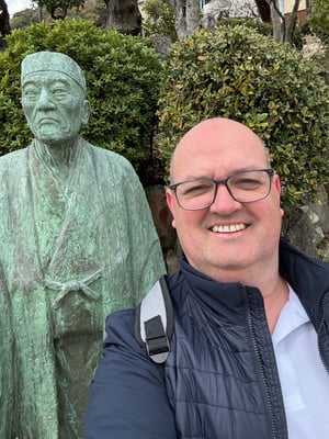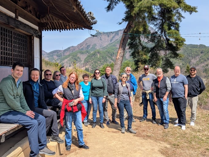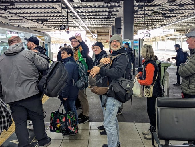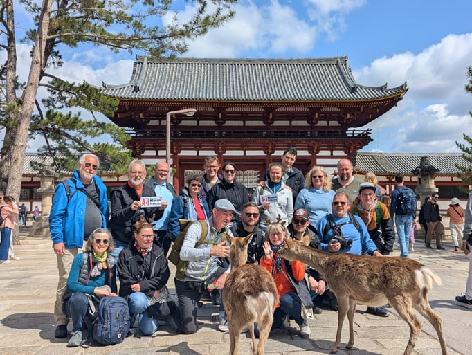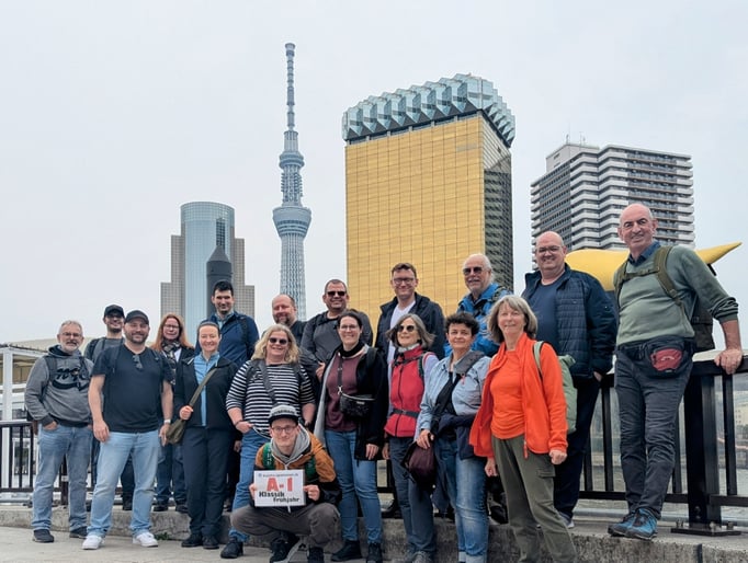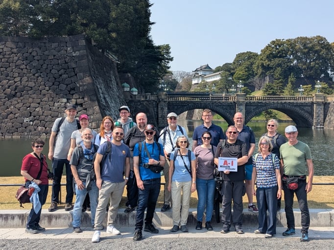 Heute ist der 25.3.2025 und Tag 3. Wir treffen uns, mitten in der Nacht, morgens um 9:00 vor unseren Einzelzimmerhotel. Gruppencheck und Mirjam gibt Programminfo. Es wird ein anstrengender Tag, vor allem für die Füße. Nach dem ersten Fußmarsch folgt die Bahnfahrt zum Meiji-Schrein. Eindrucksvolle Tore mit goldenen Chrysanthemen, und ein mächtiger Schrein (NoFoto!!!!). Wo ist Stefan? … Er ist wieder da!! Heute so viel Programm, deshalb weiter im Telegrammstil. Ab zum Kaiserpalast mit der Bahn. Kaiserpalast nur von Ferne gesehen, aber Park mit Riesenbonsais und Hochhäusern dahinter, echt Wahnsinn.