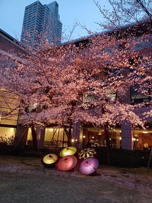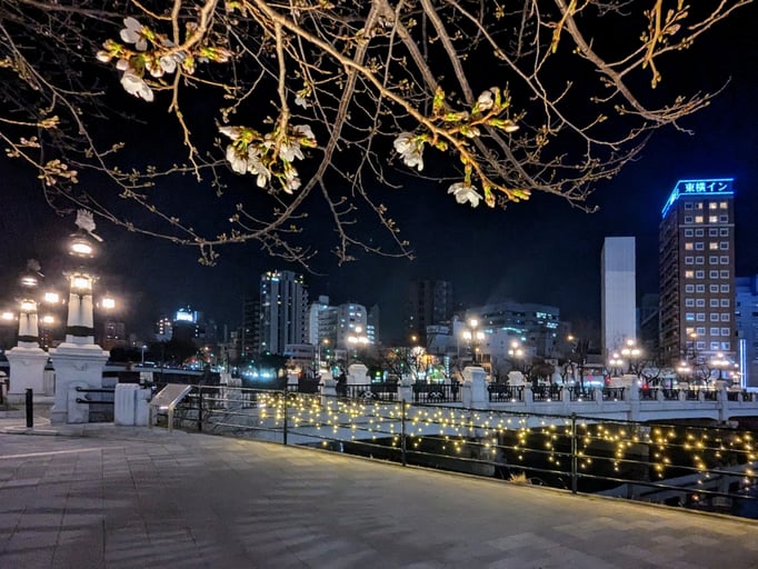 Das Highlight des Abends war die Illumination im Shukkei-en Park. Die Bäume erstrahlten im hellen und rosafarbenen Licht, der Bambus wirkte durch die grüne Beleuchtung wie verzaubert. Zurück im Hotel gab es als kleines Abendessen Onigiri.