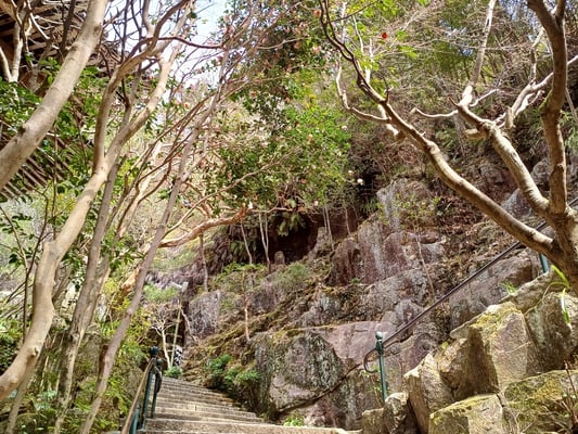 Während die einen den Tag im Café mit einem Frühstück mit Brot und Marmelade begannen, zogen andere zur Burg Hiroshima oder zum Shukkei-en Park. Wir versorgten uns im "7 Eleven" mit dem nötigen Bargeld für die kommenden Tage und fuhren dann zum Bahnhof. Dort luden wir unsere Pasmokarte auf und fuhren dann mit dem Zug bis Mitaki, um die dortige Tempelanlage Mitaki-dera zu besuchen. Die fünfstöckige Pagode, die kleinen versteckten Schreine und die vielen Figuren und Statuen mitten in dem dicht bewachsenen Park strahlten eine ganz besondere Ruhe und Atmosphäre aus. Wieder ging es mehrere hundert Stufen hinauf; zur Belohnung gab es einen tollen Ausblick auf Hiroshima.