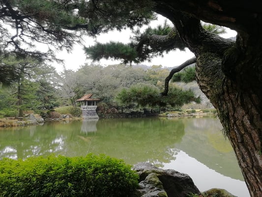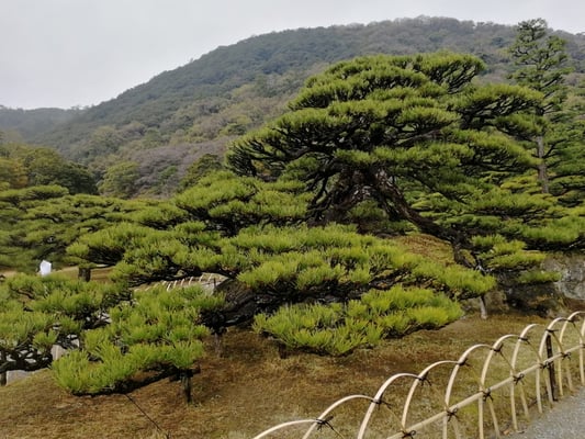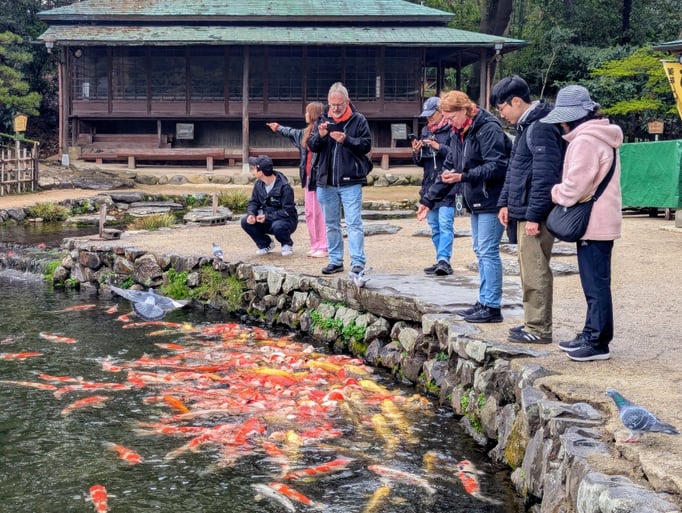 11. Tag am 02.04.2025: Da heute Nachmittag die Weiterreise nach Osaka vorgesehen war gingen wir vormittags zu Fuß zum Ritsurin-Park, einem Landschaftsgarten mitten in der Großstadt. Da es angefangen hatte zu nieseln, wählte Mirjam den Weg durch die überdachte Einkaufspassage. Im Park angekommen, regnete es zum Glück nicht mehr und jeder konnte für sich den Park entdecken. Im Park gibt es unzählige Kiefern, die durch jahrzehntelangen Rückschnitt und Formierung das Aussehen von wunderschönen riesigen Bonsais haben. Die schönste Kiefer steht auf einer Felsengruppe, ihre Zweige gehen Richtung Boden und wird "Kranich breitet seine Flügel aus auf einer Schildkröte stehend" genannt. Es gibt noch viele weitere Büsche und Bäume, die kunstvoll geformt wurden. Um 13.00 Uhr trafen wir uns wieder im Hotel und es ging per Taxi zum Hafen. Per Autofähre in 4 Stunden 40 Minuten nach Kobe. Passagiere können wählen zwischen normalen Sitzbänken oder Tatami-Matten, um dort die Zeit bis zur Ankunft zu verbringen. Wir nutzten die Zeit zum Lesen, Schlafen oder Unterhalten. In Kobe stiegen wir in den Shuttlebus zum Bahnhof und von dort ging es per Zug weiter zur Haltestelle Juso (ein Kreuz und drei horizontale Striche). Das Hotel liegt wenige Minuten vom Bahnhof entfernt und - Hurra - unser von Hiroshima voraus geschicktes Gepäck wartete in der Lobby auf uns. So konnten wir unsere Zimmer beziehen. Warum allerdings die Einzelzimmer-Leute nach drei von fünf Nächten in andere Einzelzimmer umziehen müssen, weiß nur der japanische Gott der Bürokratie.