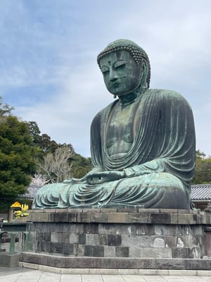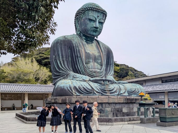 Unser erster Halt war Daibutsu, Heimat des Großen Buddha von Kamakura. Schon von Weitem beeindruckt die 13 Meter hohe Bronzestatue mit ihrer stillen, meditativen Präsenz.