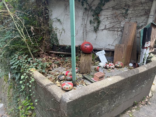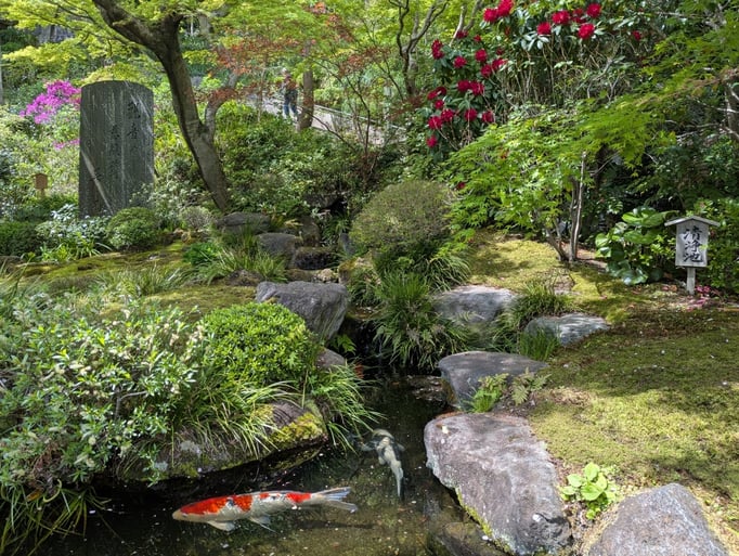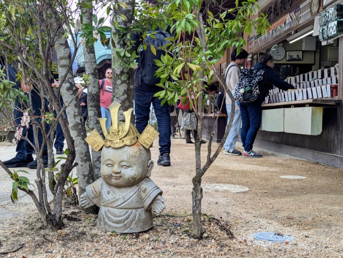 Danach machten wir uns auf den Weg zum Hase-Kannon, ein wunderschöner Tempel, der an einem Hang liegt und eine atemberaubende Aussicht auf die Bucht bietet. Die Wege waren gesäumt von kleinen Jizō-Statuen, ein Ort voller Symbolik und Stille. Wir blieben eine Weile im Garten, begleitet vom Plätschern eines kleinen Wasserfalls.