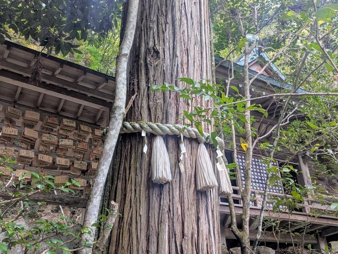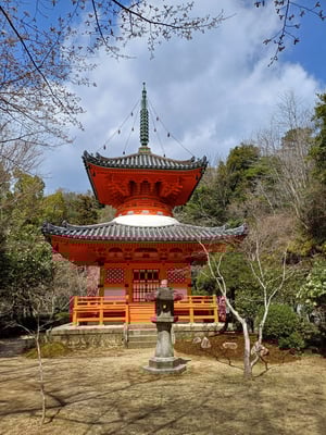 Auf dem Weg nach oben kommt mir ein Bewohner entgegen, der mich zumindest freundlich grüßt. Ich nehme dies als gutes Omen und gehe weiter nach oben. Oben angekommen treffe ich auf einen Arbeiter, der sich wohl um diesen Schrein kümmert. Er steigt in sein Auto ein und scheint wegfahren zu wollen. Ich fange erstmal an mir den Schrein bzw die 3 kleinen Schreine anzusehen. Nach ein paar Minuten merke ich, dass das Auto immer noch läuft, also schaue ich mal in Richtung Eingang und ja, der Fahrer scheint darauf zu warten, was ich hier tue. Nunja wann kommt schonmal ein Ausländer hier her. Ich entschließe mich zu gehen, um den Mann nicht länger von seiner Arbeit ab zu halten. Beim Verlassen des Schreins sehe ich dann auch den gesuchten Tempel. Er war nur einfach nicht von der Straße aus zu sehen über die ich gekommen war.