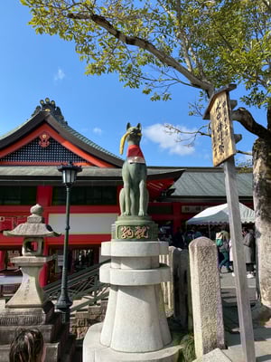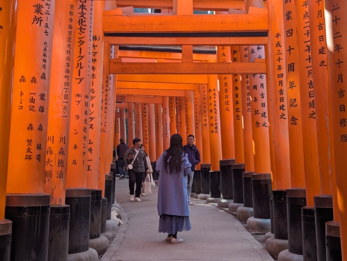 Gestärkt machten wir uns auf den Weg zur letzten Station des Tages: Fushimi Inari, eine der faszinierendsten Tempelanlagen Japans. Die unzähligen roten Torii, die sich den Berg hinaufziehen, und die geheimnisvollen Fuchs-Statuen, die als Boten des Reisgottes Inari gelten, verliehen dem Ort eine magische Stimmung. Leider war die Zeit viel zu knapp, um alles ausgiebig zu erkunden – ein guter Grund, irgendwann wiederzukommen!