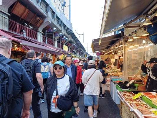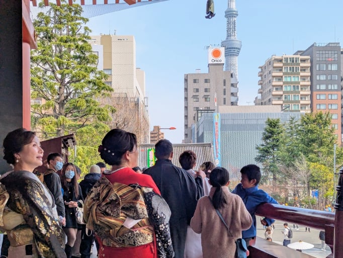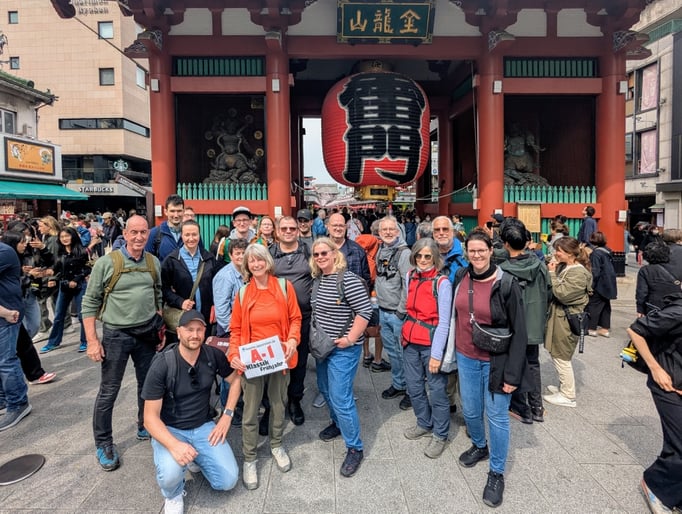 Wir treffen uns beim Gate am Münchener Flughafen. Nach einer gefühlten Unendlichkeit landen wir sicher in Haneda. Mit der S-Bahn fahren wir zum Hotel, um unsere Koffer abzugeben. Überall sind erschöpfte, aber glückliche Gesichter zu sehen. Nach dem Mittagessen unternehmen wir einen Spaziergang zur Asakusa Tempelanlage. Wir beten für schönes Wetter und Reise-Sicherheit. Vom Tempel aus hat jeder die Möglichkeit Tokio auf eigene Faust zu erkunden.
