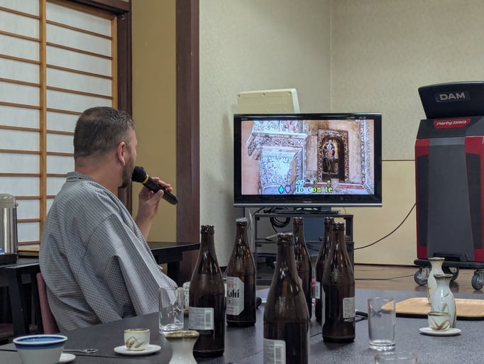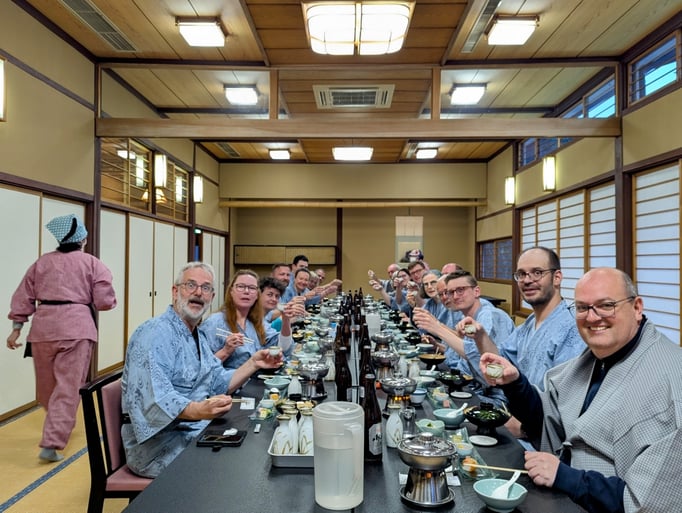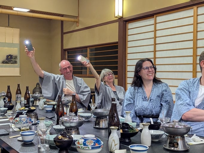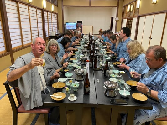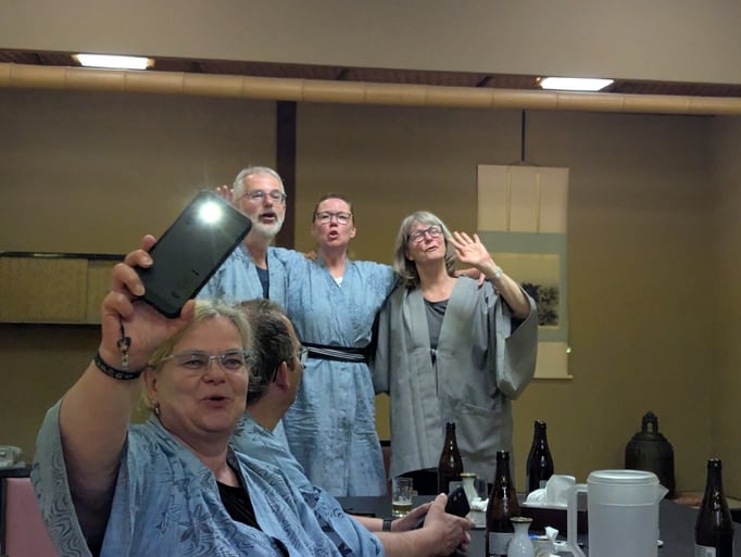 Am Bahnhof Ueda wartet schon der Hotelbus. Alle rein und los geht’s zur heute letzten Etappe: Zu unserem traditionellen Onsen-Hotel. Schuhe aus, Schlappen an, kurze Führung durchs verwinkelte Hotel. Dennoch, jeder hat sein Zimmer gefunden. Tolles Zimmer, so richtig in Japan-Style. Zeit für Tee und Onsen bis zum Abendessen. Das Abendessen nehmen wir in Yukatas gekleidet an einer langen Tafel ein. Wir lassen uns die kreativ gestalteten Leckerbissen schmecken. Japanisches Bier und heißer Sake gehören natürlich auch dazu. Die Krönung waren Karaoke Darbietungen einiger Mitglieder unsere Gruppe und unserer Reiseleiterin Mirjam, die alle mit tosendem Applaus belohnt wurden. Der harte Kern hielt es mit dem übrigen Bier bis zum „Rausschmiss“ gegen 21:00 aus und verabschiedete sich dann ebenfalls auf die „Reismatte“.