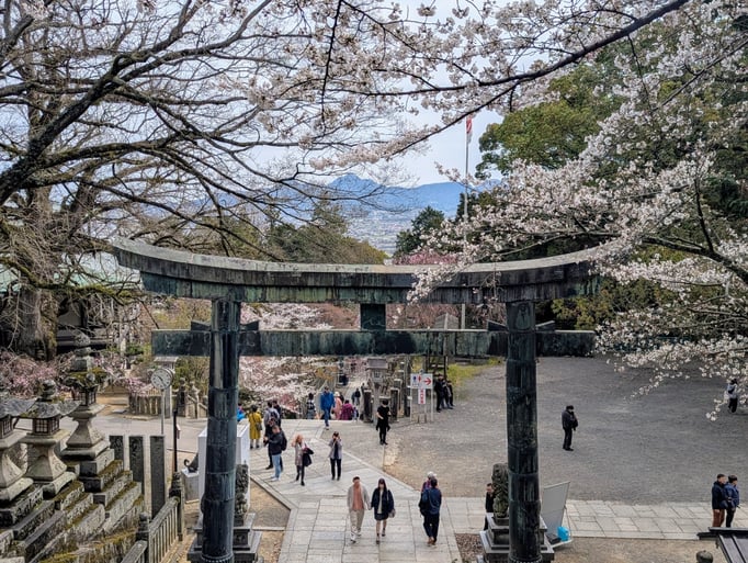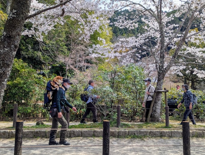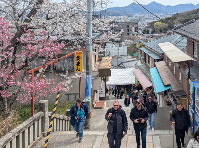 Alle bezwingen wir die vielen Stufen (1.368) bis zum letzten Schrein, Oku-sha Schrein und natürlich finden wir auch Tengu-men im Felsen - unserem Glück steht nichts mehr im Wege. Am Weg retour sehen und füttern wir die Papageien-Meisen und natürlich darf auch die Herstellung der Udon Nudeln mit Verkostung nicht fehlen. Die vielen Shops an den Stufen verlocken mit ihren schönen Dingen zum Kauf. Und nicht zu übersehen sind die vielen Kirschbäume in voller Blüte - eine Augenweide.
