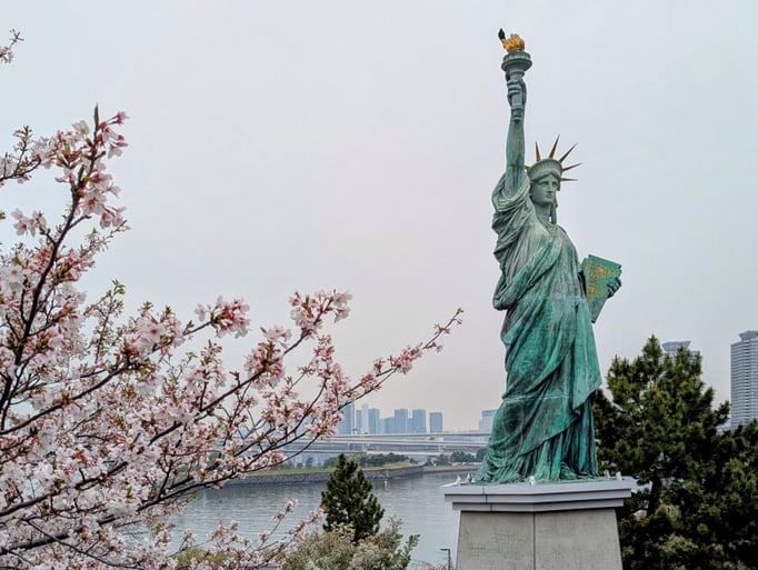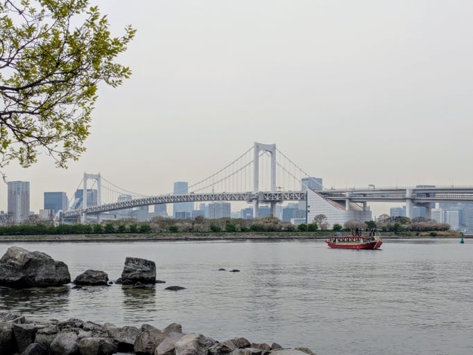 Um 10 Uhr starteten wir Richtung Odaiba - mit der Monorail über die Rainbow-Bridge bis zur Halbinsel. Das Wetter hielt zum Glück und es war warm, so dass einem Spaziergang am Strand entlang über die Freiheitsstatue bis zur großen Gundam-Statue nichts im Weg stand.