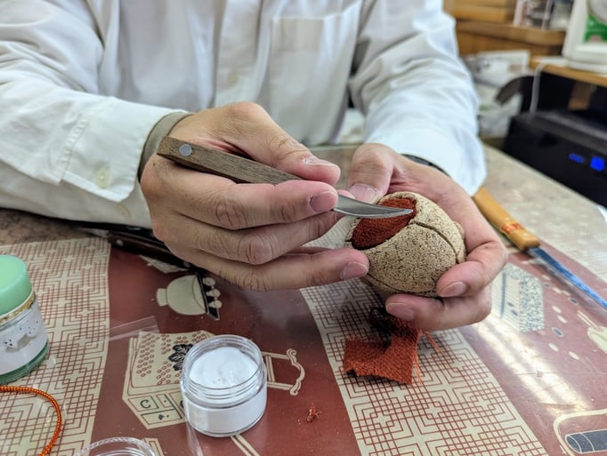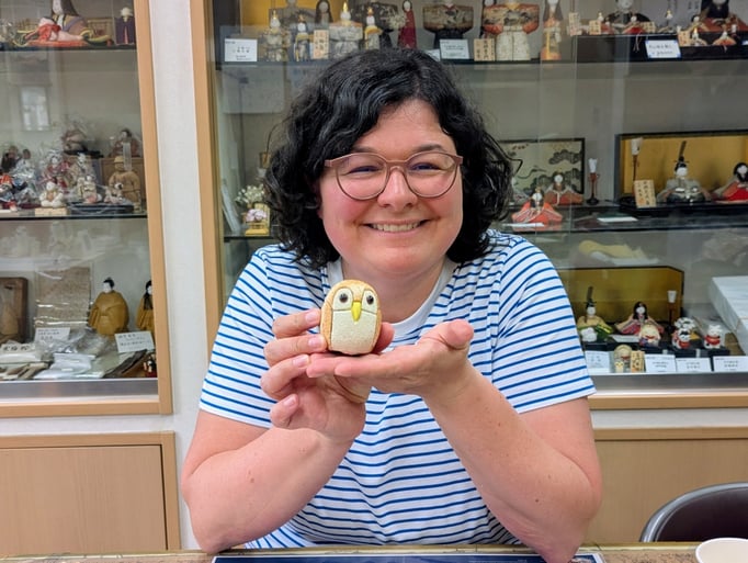 In der Nähe des Sky Tree gibt es eine alteingesessene Puppenwerkstatt und ich habe mir einen Termin für einen Workshop ausgemacht. Der Junior Chef möchte sein Englisch üben, ich mein Japanisch, und so erfahren wir ein bisschen voneinander, während ich nach Anleitung eine seiner vorbereiteten Sägespäne-Pressformen mit Stoff bespanne, um eine kleine Eule zu basteln. Ich bin natürlich höchst talentiert und wir sind beide mit meinem Ergebnis sehr zufrieden.