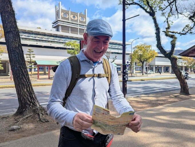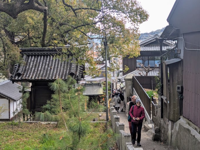 Als die Türen zu gehen, merke ich. Ups. Die Reisegruppe ist auf dem Bahnsteig und ich noch im Zug. Durch die bewährte Durchzählung wird meine Abwesenheit sofort registriert und Mirjam klingelt mich an und erläutert mir den Reiseablauf in Onomichi. Ich steige einen Bahnhof später aus und fahre zurück noch Onomichi. Nach ca einer Stunde bin ich wohlbehalten wieder bei der Reisegruppe gelandet.