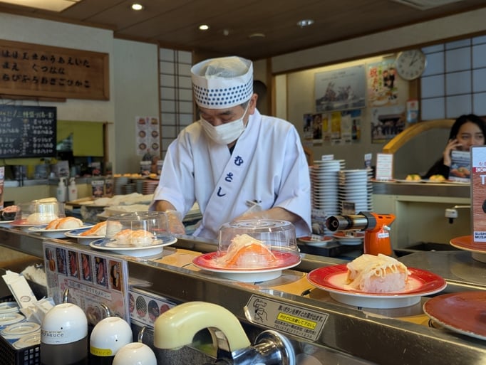 Nach einer kurzen Busfahrt erreichten wir die Fußgängerzone Kyotos, wo jeder individuell die Mittagspause gestalten konnte. Einige von uns entschieden sich für ein Running Sushi-Restaurant mit einer beeindruckenden Auswahl an landestypischen und überraschenden Köstlichkeiten.