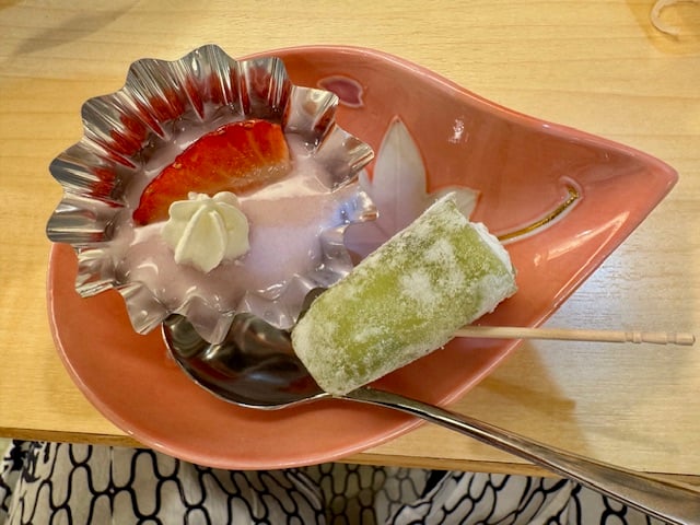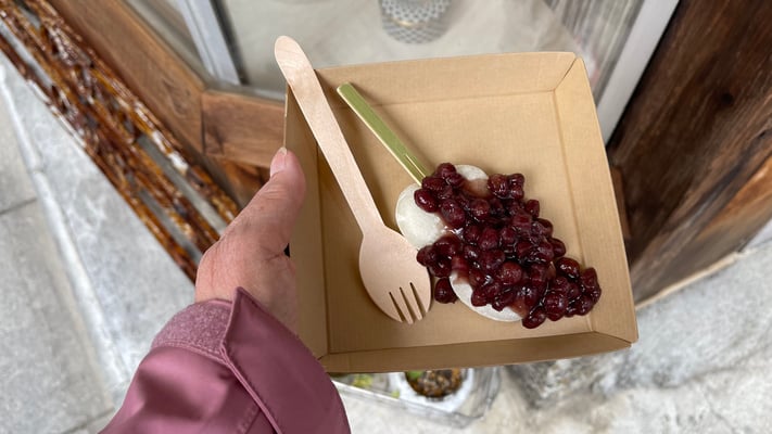 Zur Yanaka Ginza war es nicht weit. Eine Einkaufsstraße für den täglichen Bedarf der Bewohner. Na ja, es sind schon sehr viele Souvenierläden angesiedelt. In einem Geschäft gab es Mochi mit verschiedenen Belägen. Ich nahm Rote Bohnen. Im Gegensatz zur sonstigen Zubereitung konnte man die roten Bohnen noch erkennen.