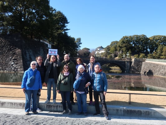 Große, im Winter gelbe Rasenflächen mit Bäumen säumen den Weg bis zum Palast. Wir machen ein Gruppenbild und schauen uns auf dem Rückweg noch die große Samurai-Statue am Ausgang an.