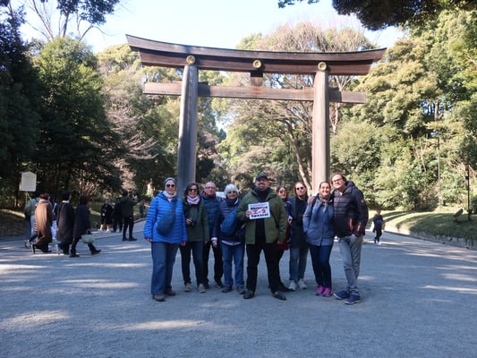 Heute sind wir mit der Gruppe direkt nach dem Frühstück mit der U-Bahn in den Osten Tokios gefahren. Bei schönstem Sonnenschein sind wir durch einen Park zum Meji Schrein spaziert. Allein der Weg dorthin durch den kleinen Wald war sehr schön. Eine Oase der Ruhe mitten in der großen Stadt.