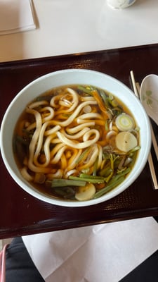 Um 13.00 Uhr geht’s weiter. Da ich so viel gefrühstückt hatte, wollte ich nicht Mittagessen. Zum Schrein hätte ich zeitlich nicht geschafft. Die Geschäfte auf der Straße zum Schrein waren schnell durchgesehen. Ein Mochi am Stäbchen hat dann doch den Appetit angeregt. Als ich dann noch Soba gelesen habe, war es mit meiner Zurückhaltung vorbei. Ich traf Frank und Kerstin und wir suchten am Automaten unser Essen aus: Udon mit Gemüse.