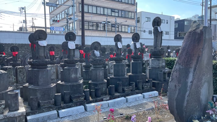 Mein nächstes Ziel war der Tempel Choanji. Google Maps führte mich quer über den Friedhof auf einzelnen Pflastersteinen zwischen den Gräbern durch. Wohl der kürzeste Weg. Weiter ging es zum Tempel Jomyoij mit 84.000 Jizo-Figuren. Diese Figuren sind Kindern gewidmet, die vor ihren Eltern sterben, teilweise haben sie rote Mützen auf und Lätzchen an.